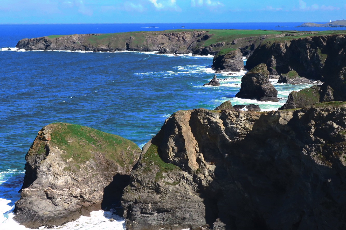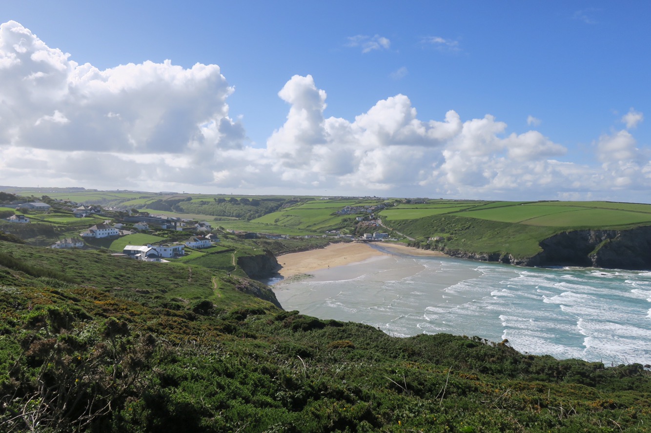 Another gloriously sunny day on the South West Coast Path…this could be purported to be boring but far from it! Yes, everyday I see pale yellow sand, blue sea with foaming white waves crashing against the brown/black rocks, blue sky with white fluffy clouds and green fields but every cove, each twist and turn and all the ups and downs reveal different views as you go along. Early on in the morning I passed the Bedruthan Steps which are a series of rock formations out in the bay: