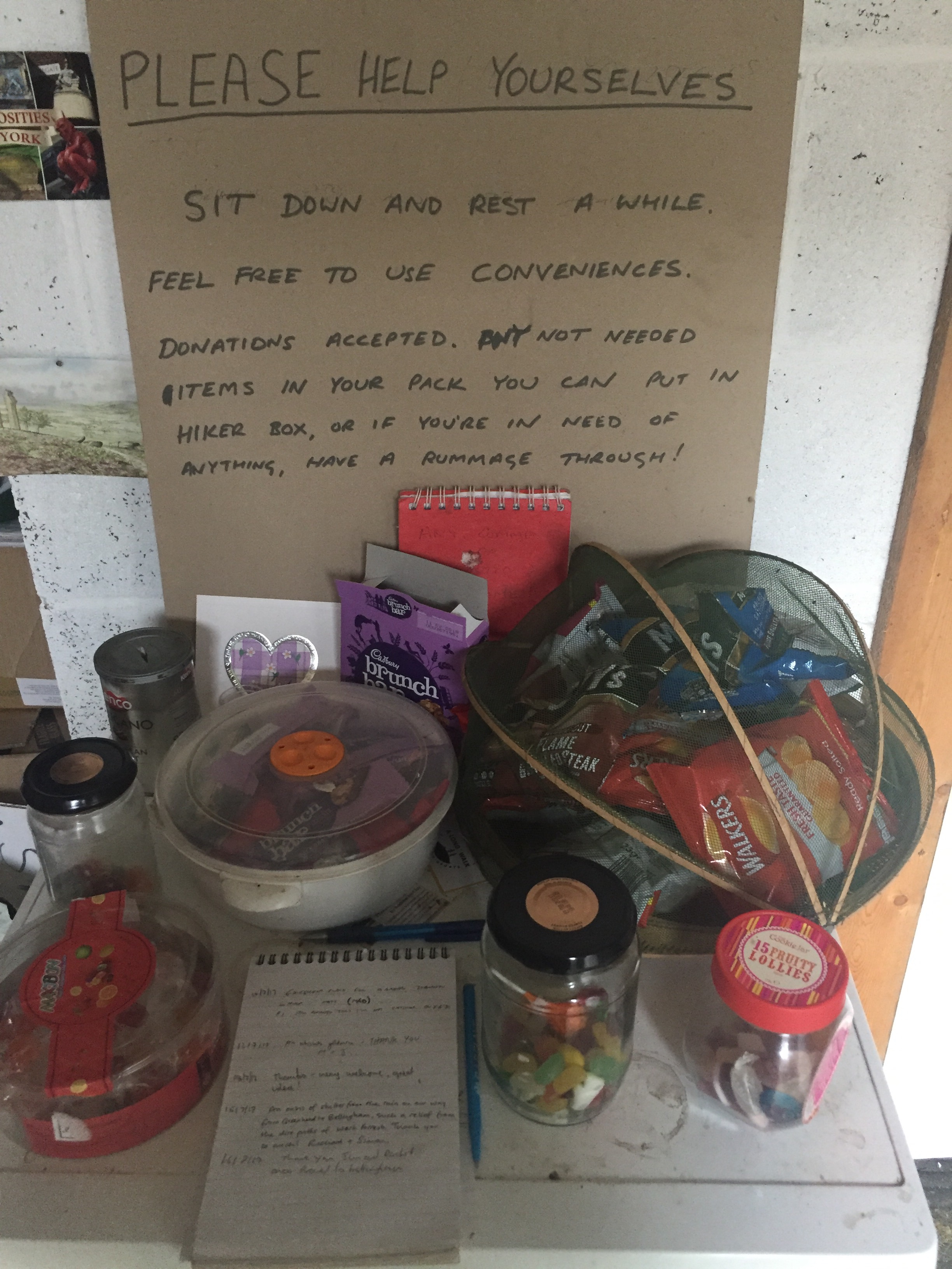 It was a fairly uninteresting 7miles but I did find a ‘Pit Stop’ for Pennine Way walkers. Little signs and arrows pointed you in the direction of a former stable building that had been transformed into a hikers haven/treasure trove. It had seats, snacks, drinks in the fridge, a kettle plus accoutrements, toilet and shower, washing machine and tumble dryer (these may have just been the owners’), oh and a little box of hiker goodies – a spare guidebook, plasters etc. As it happened I didn’t really need anything, but I could have done with something similar many a time. Such generosity from the owner to let hikers hang out in their barn – love it. It got me thinking; why haven’t I seen more hospitality based on honesty? Perhaps it’s just too much effort.