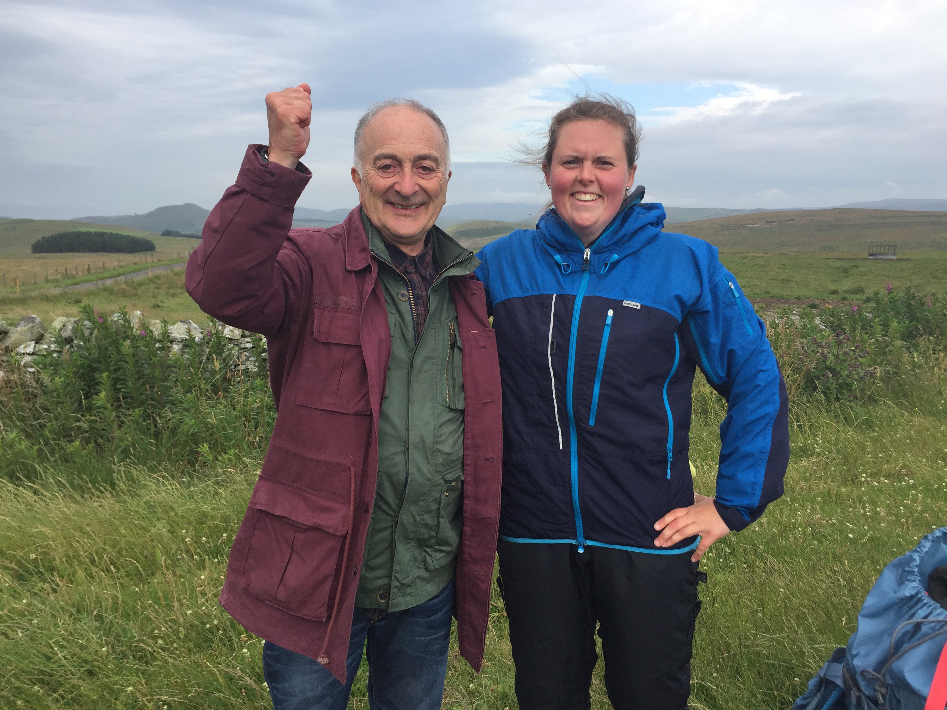 I was now walking along Dere Street which is a Roman road built well before Hadrian built his wall. It runs from York to Edinburgh and I’d be walking it for the rest of the day until I found a wild camping spot. The border did signify a game changer – I could now legally wild camp almost anywhere, which makes the planning a bit easier. No campsites? No worries, just stock up on food, refill water from a stream and I’m good to go wild camping anywhere. I had my eye on a particular hill and getting closer I started looking for spots. When Dere Street met a lane there was a bench on a flat-ish area of grass. Looking ahead, the hill I’d seen on the map was nothing like reality. The area of woodland had been felled, the walls/fences had been removed and it was littered with cows and sheep. The area by the bench would be more than sufficient so I stopped there and then. It was only 5pm so I didn’t pitch up, instead I wrote my diary, did some stretching and sat upon my bench. The lane was very quiet, only 1 or 2 cars an hour or so, that was until no less than five 4x4s came screeching to a halt right alongside me and turned my tranquil spot into a car park. Well I was fuming, “who the bloody hell are this lot and what do they think they’re doing just parking all over my abode?” Then Tony Robinson got out, and all was forgiven! He was with a TV crew and they’d arrived to do some filming on Dere Street for a series called Ancient Tracks. Once he’d heard about what I was doing there, he came over, shook my hand, congratulated me and posed for a photo. I spent a good hour or so talking to various members of the crew (who gave me 2 bottles of water and a banana) and before I knew it they were gone again. What a surreal moment!