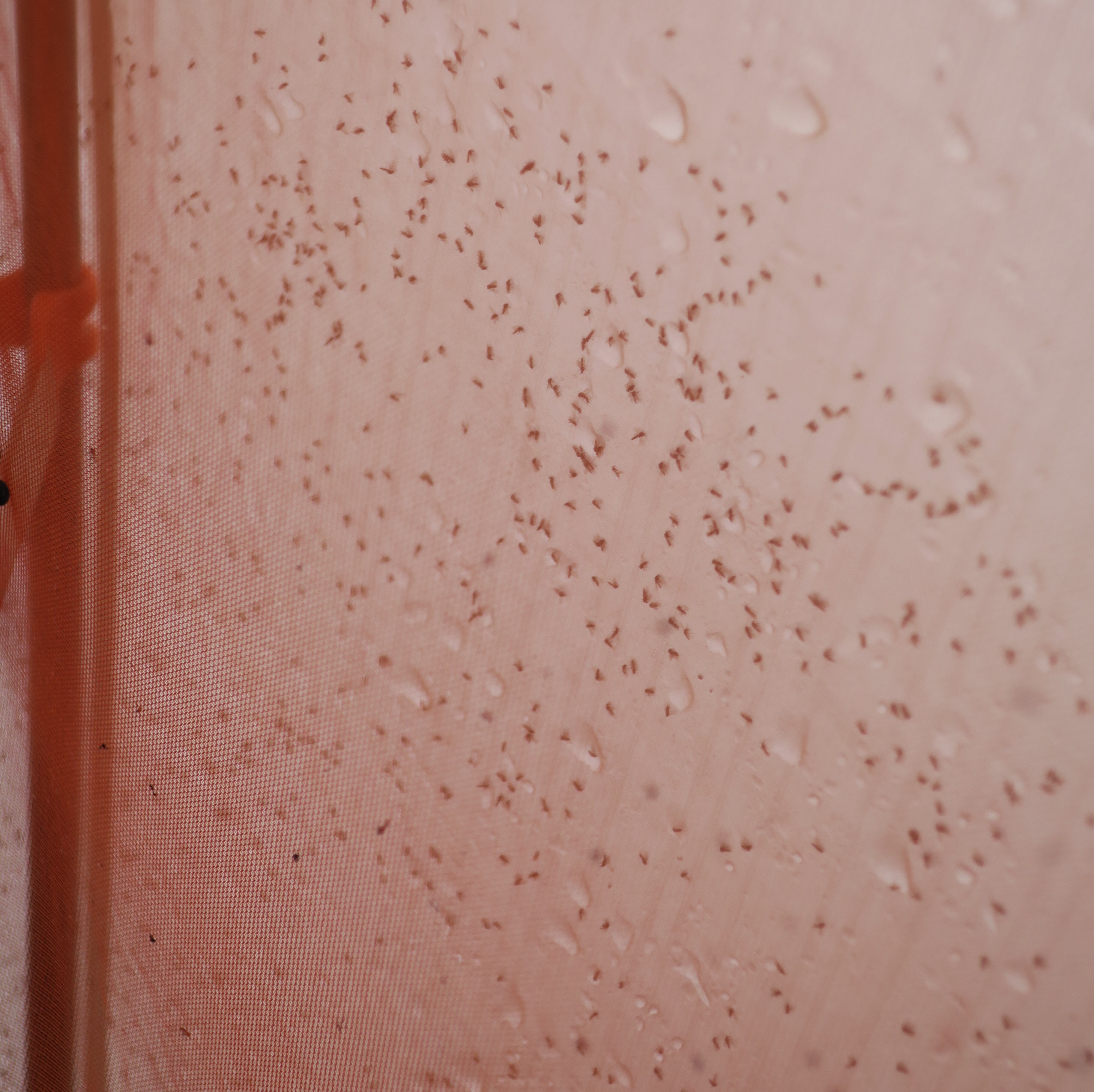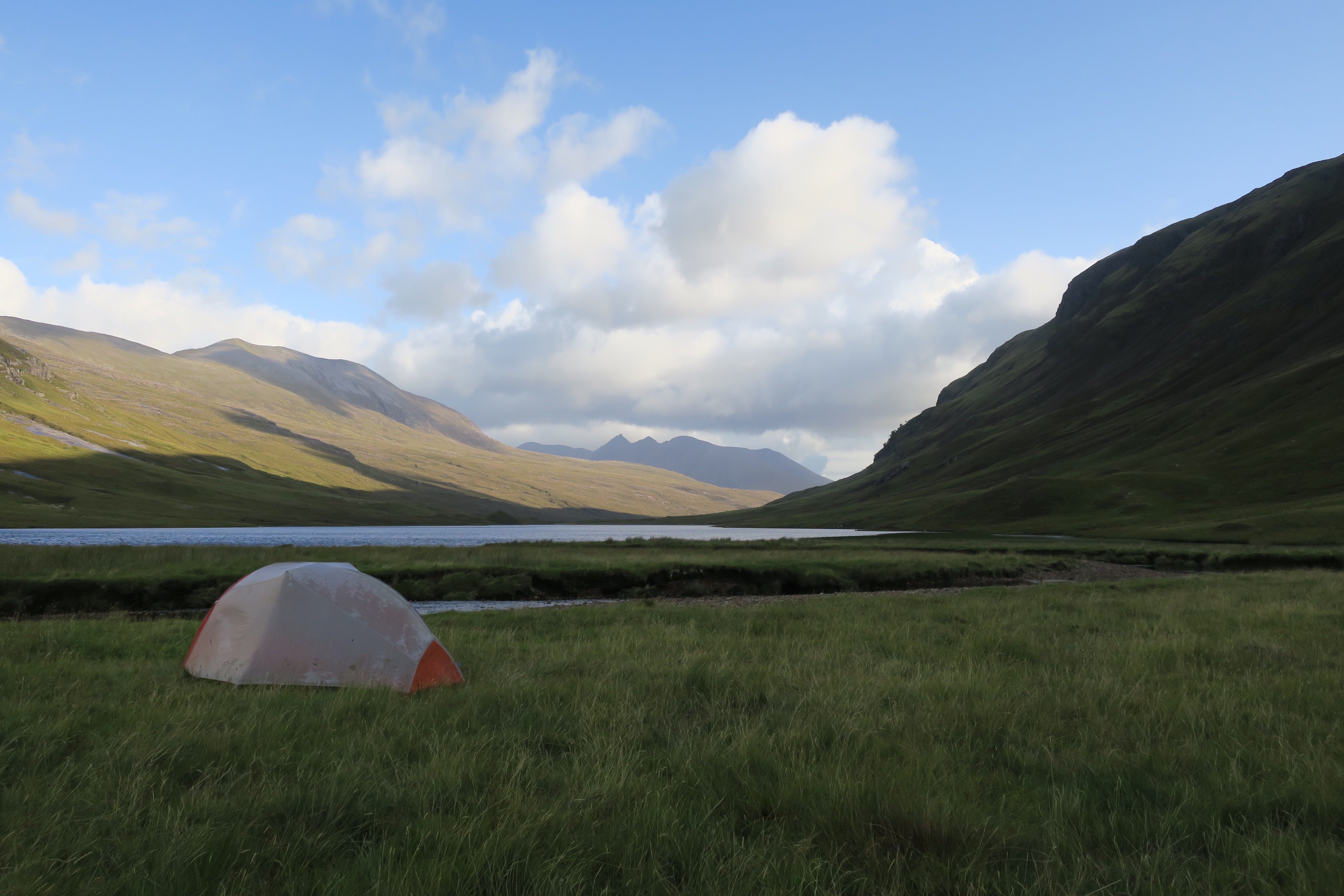 Once I turned off the road it was more pathless, boggy terrain with a few sheep dotted about and a huge herd of deer. I started heading up along a stream and the wind was picking up and bringing with it some dampness in the air. Upon reaching the top; a large peat hag plateau (it felt remarkably like Kinder Scout), the rain really came over and I decided I didn’t want a repeat of yesterday and so just stopped in my tracks and pitched my tent. Amazingly I had 4G so I checked the weather and it was due to pass relatively quickly. It was around 13:30 so I ate lunch and wrapped myself in a foil blanket to try to keep warm. The rain was heavy and consistent until 15:30 when it practically stopped so I leapt out and packed a very wet tent.