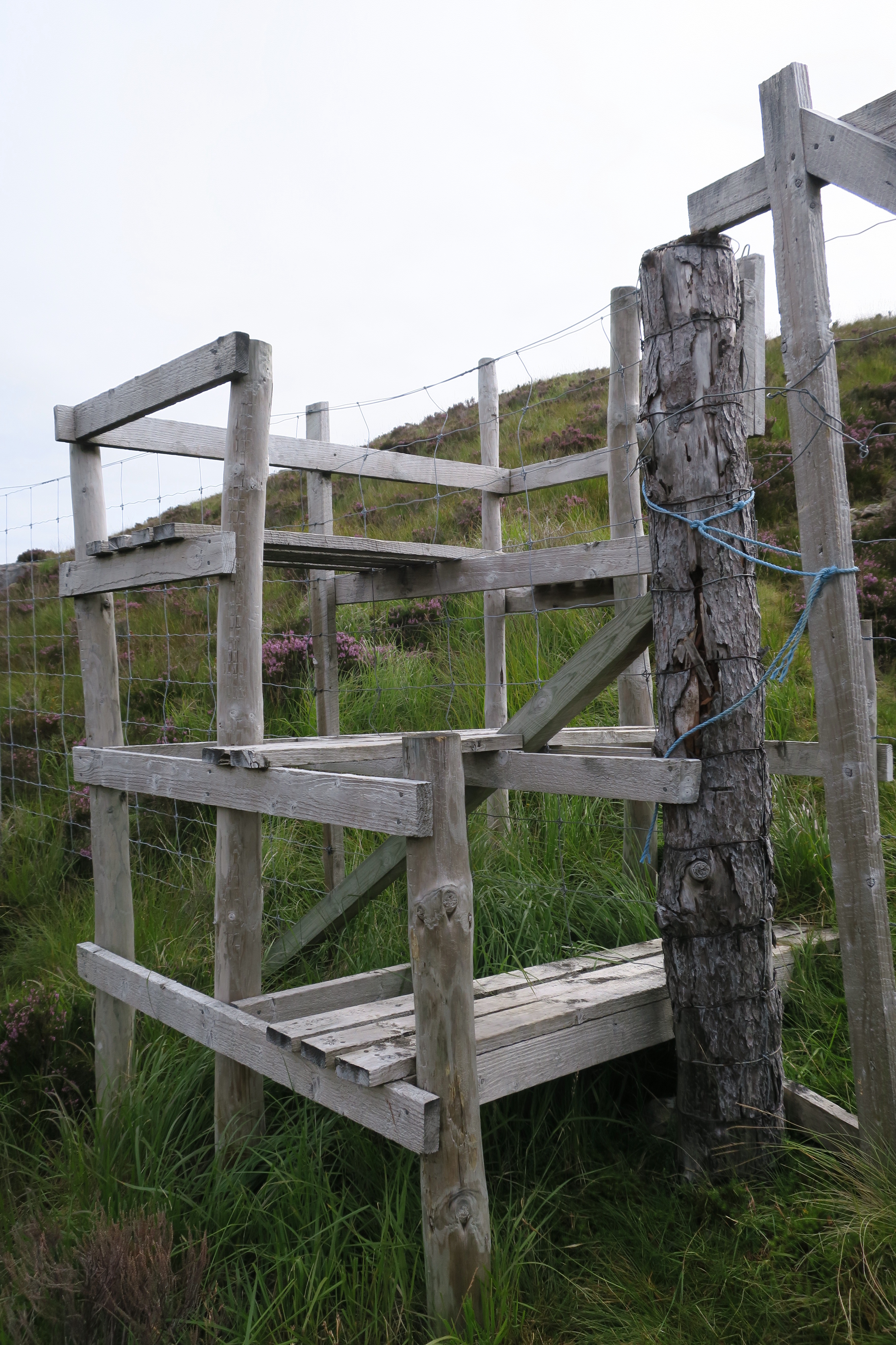 The game keeper then passed by one more time (he’d been on his weekly 52mile round trip to the supermarket!) and he offered me the shelter of his cottage at Glutt; a spare bed, hot food and somewhere to dry my tent. I didn’t hesitate. We had a cup of tea in his kitchen and chatted, his name was Gus (originally from Derbyshire) and this was his forth season as the game keeper out here. Over the course of the day I learnt about stag hunting, grouse shooting, falconry, estate life and pointers (he had 3 English pointers; Pluto, Tosh, and Gromit the 14week puppy and an English setter; Broch). In the afternoon, some clients of a neighbouring estate came over in the hope that Gus could take his peregrine falcon out to catch a grouse. I went along and although Tosh was able to point out a grouse it was too windy for the falcon, but I certainly enjoyed the privilege of a ride in the back seat of the Land Rover with the falcon!