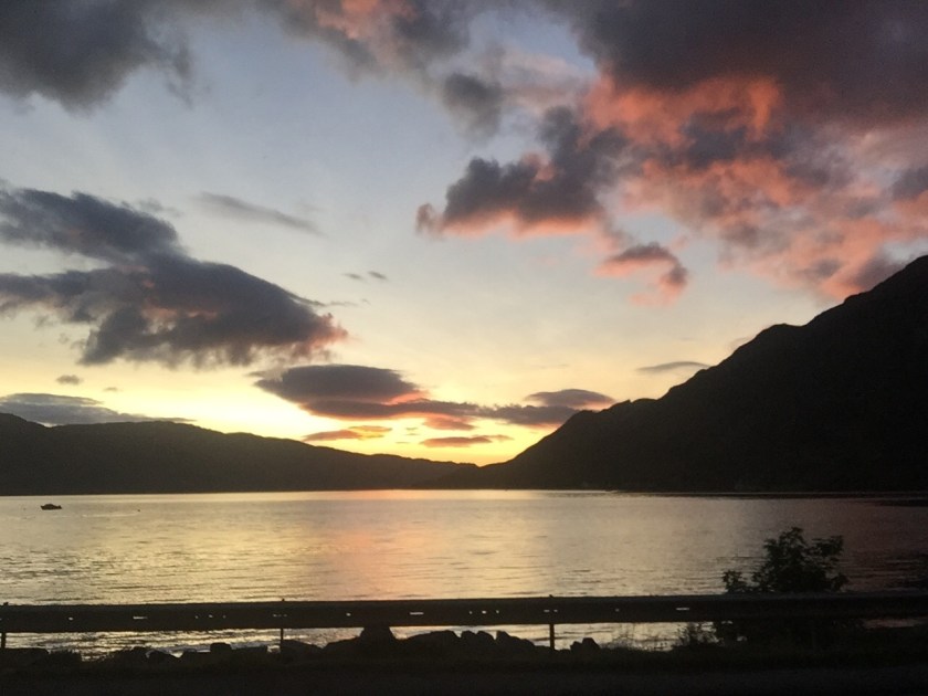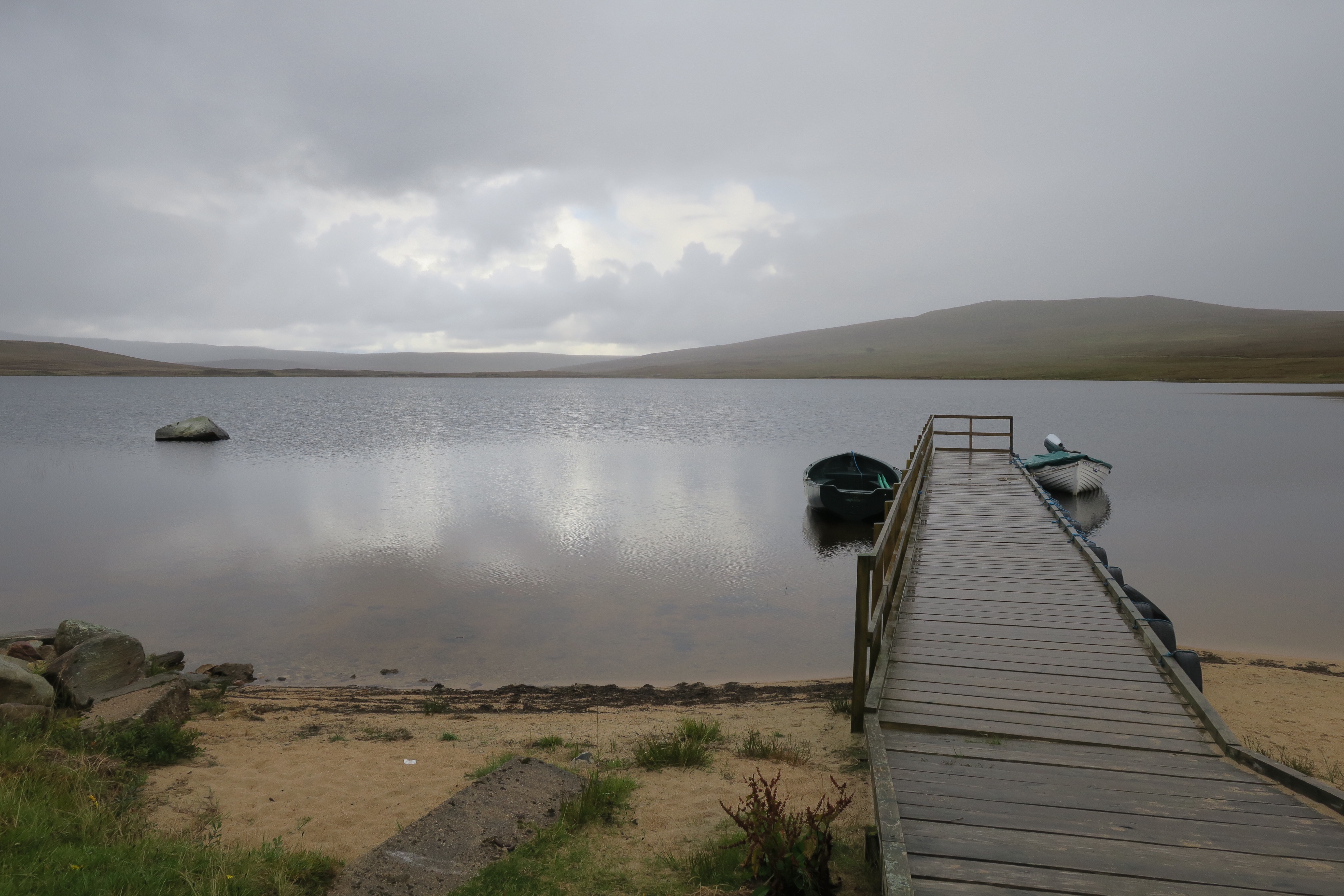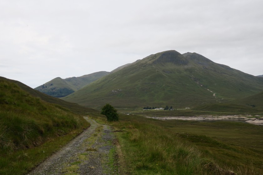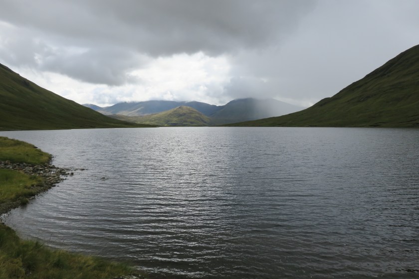 In the morning it was warm, dry and a lack of wind brought out the midges but I enjoyed a nice amble all the way down the lochside. From the lodge, it’s 11 miles along the access track to the road, it was going to be tedious but there was a 2 mile section of footpath which cut off a corner and broke up the monotony. I took lunch on a jetty that stretched out on to the waters of a loch and just as I was finishing it started to spit. I wasn’t concerned.