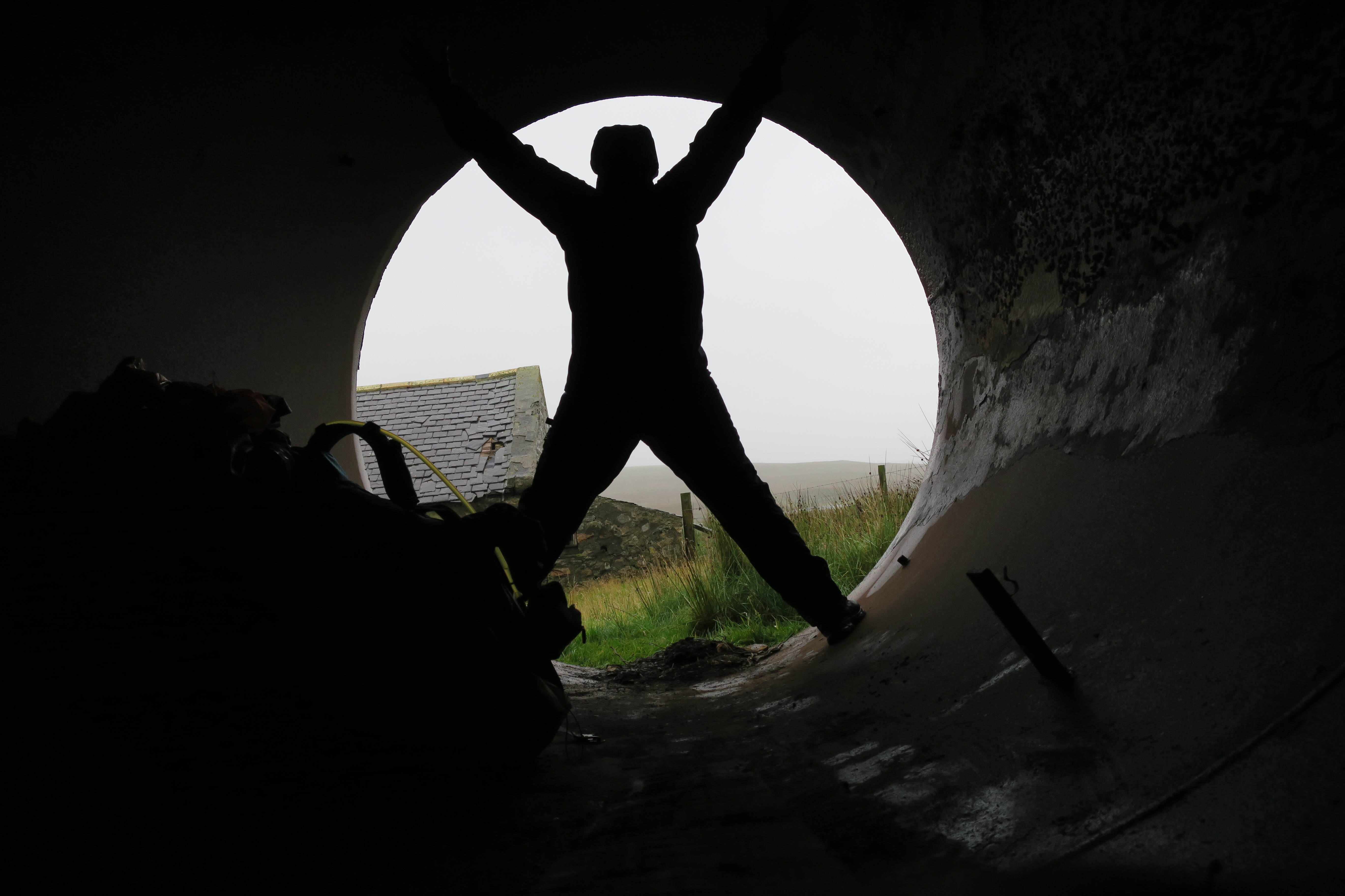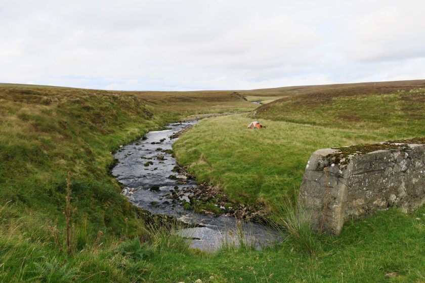 I set my alarm so that I could leave promptly the next morning. I needn’t have bothered with the alarm – I was awake most of the morning hours with rain hammering down on the tent and the wind whipping through too. Perhaps the worst of the weather was 24hrs late? It was far worse than the previous day so I was in for another long stint in my tent with diminishing food supplies. Overnight the river had risen from a tame trickle to more of a rush but I was still a little way away and I checked it every so often. At around 10:30 the game keeper swung by again in the pouring rain and said that the river would continue to rise and could well reach the level of my tent. I thanked him and did not hang about, I could see it had risen considerably since the last time I’d checked; it was now a torrent and I didn’t want to take any risks. I hurriedly packed up and headed for the shelter of a nearby derelict cottage with outbuildings and what appeared to be an old and empty silage tank on its side. I settled down in the old tank, doing star jumps to keep warm and found a flat-ish, dry-ish and sheltered-ish piece of ground that I would pitch my tent on, should the weather ease at all.