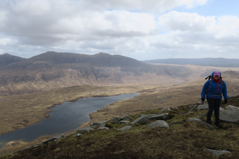 It’s a more leisurely start this morning and we’re walking by 10, but we don’t have a long route planned. Up Ben More, over the top, down to the bealach, into the valley and then follow the track back. It’s raining as we start and after ascending via a track, we turn up the muddy hillside where soon the ground and air are filled with snow. It’s here that Rob decides that a niggle he’s got is too sore to continue, so off he goes and takes his car with him but he offers to come and pick us up once we’re finished.